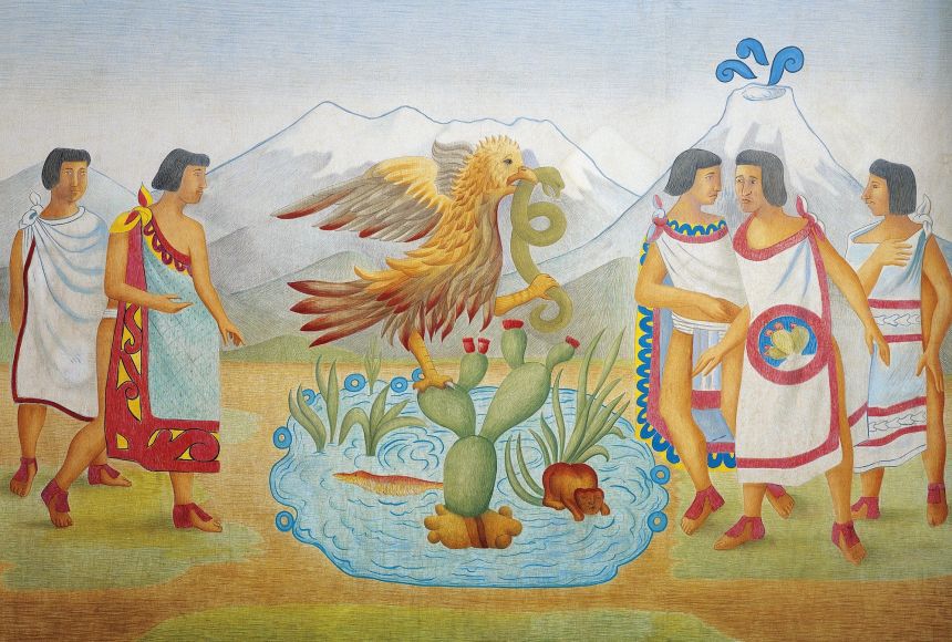 Σε ένα ειδικό σημείο του οροπεδίου Αναγουάκ, οι Αζτέκοι ίδρυσαν την πρωτεύουσα τους Τενοτστιτλάν, εκεί ακριβώς όπου συνάχτηκαν τα ιερά σύμβολα που είχαν προφητευτεί από τους οιωνοσκόπους και μάντεις: Είδαν έναν αετό, σύμβολο του ήλιου και του Ουιτσιλοπότσλυ (θεμελιώδη θεού της φυλής τους), που καταβρόχθιζε ένα φίδι, αφού είχε παλέψει μαζί του. Ο αετός καθόταν πάνω σ’ ένα φυτό νοπάλ, ένα είδος κάκτου. Το θεώρησαν οιωνό κι εκεί έκτισαν την πρωτεύουσά τους.